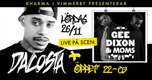 Då är det nämligen dags för vinterns första livespelning med även nattklubben öppen. Till oss kommer inga mindre än DaCosta, Gee Dixon & Moms, tre av de hetare namnen på Sveriges hiphopscen, för en unik liveshow! Dessutom kommer de efter spelningen stanna kvar och mingla med er. :)